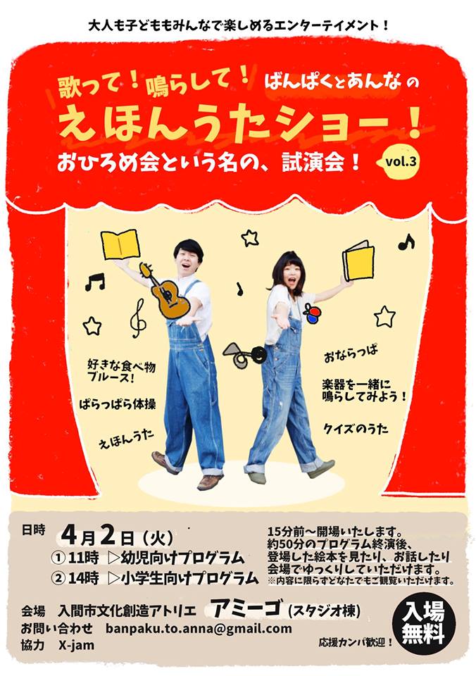 この度、それぞれ音楽活動の中で子どもたち賑わせてきた二人が、親子向けユニット「ばんぱくとあんな」を組み、1時間のプログラムを作りました!これを引っさげ、全国の保育園や学童、イベントなどで活動を展開していきたいと思っています。つきましては、お披露目会という名の試演会を企画致しましたので、ぜひ足をお運びいただき、ご意見ご感想をお聞かせいただければ嬉しいです。よろしくお願い致します!
