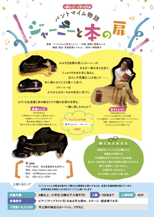 会場条件 ピアノ(アップライト可)のある平土間、ステージ 鑑賞人数 150名程度まで 上演時間 45分パントマイム